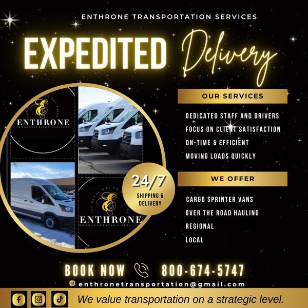 We pride ourselves on building a legacy through our dedicated staff and drivers. Enthrone is committed to expediting shipments from pick up to delivery. Whether it’s packages or pallets, same day or overnight, our mission is to provide world-class solutions to fit your timely needs.